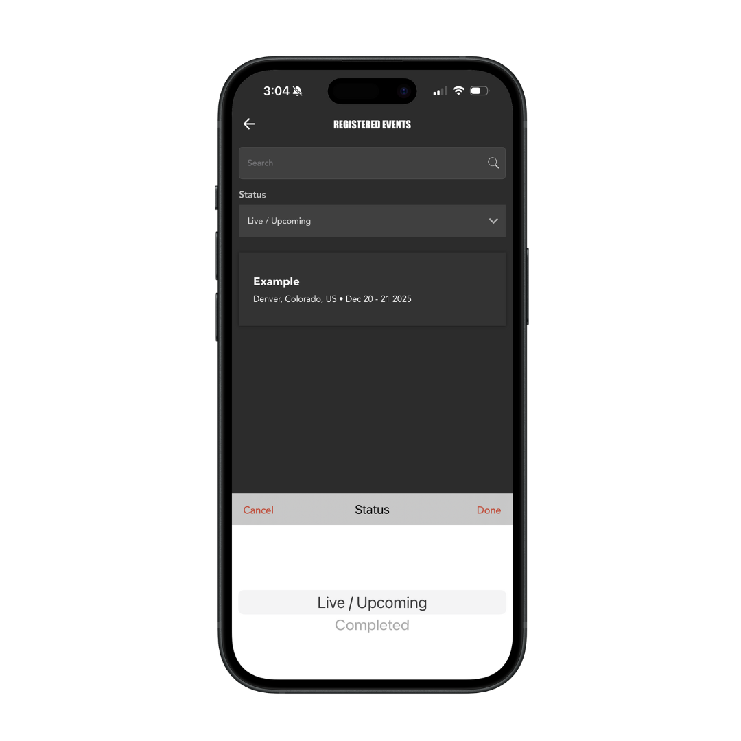 Click “Live/Upcoming” to open the dropdown filter where you can select “Completed” to filter by completed events.
